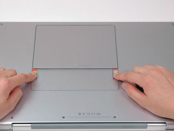 - Lắp đầu phẳng của một thanh kéo dài giữa khung bezel mặt trước và dải nhựa được gắn vào bezel phía sau gần các lỗ vít ở các góc dưới cùng của màn hình.